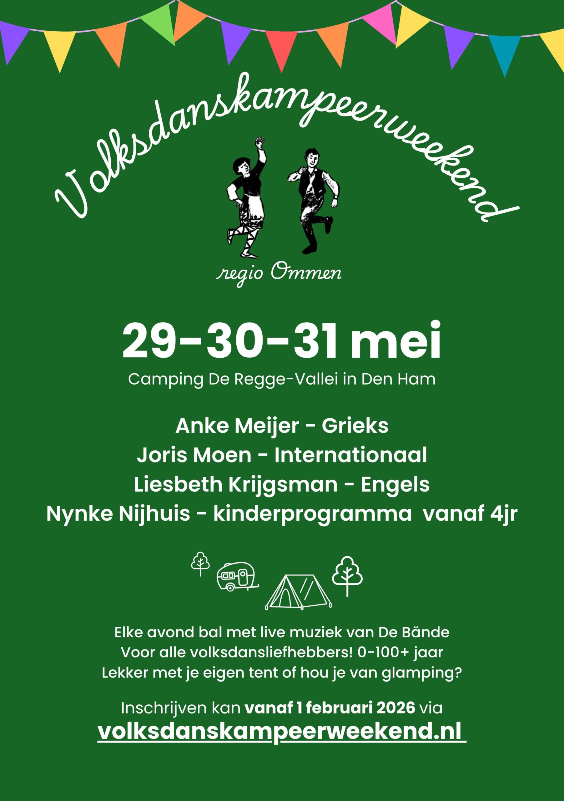 Eenmaal per jaar organiseert Dansberaad Overijssel een Volksdanskampeerweekend, meestal in het weekend na Pinksteren, in 2026 zal het zijn van 29 t/m 31 mei. Dat is inmiddels al een leuke traditie van meer dan veertig jaar. Het weekend heeft een kleinschalig karakter en er zijn maximaal 150 deelnemers. Overdag zijn er workshops voor beginners en gevorderden, ‘s avonds is er bal en het hele weekend hebben we levende muziek van een volksdansorkest.